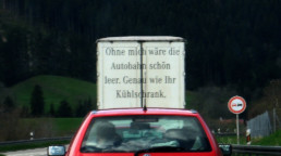 da erzählt mir der sch*** lkw, dass ohne ihn gar nichts ginge und lässt mich dann ne halbe stunde hinter sich herfahren... ok. irgendwie hat er ja recht, aber mein kühlschrank ist deswegen auch nicht voller...